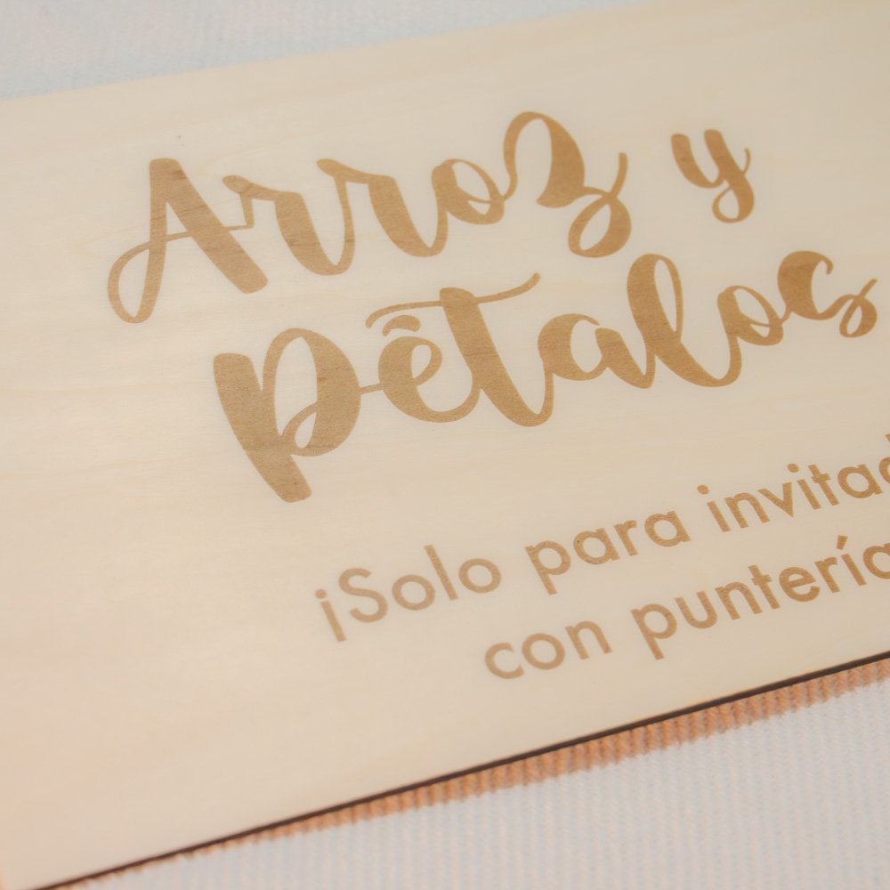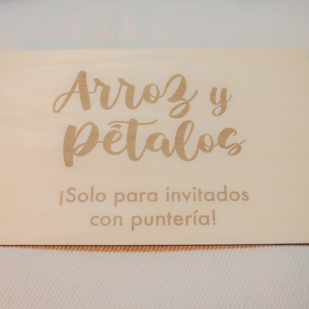 Cartel para grabado en madera de pino para indicar a los invitados a tu ceremonia el lugar donde encontrar los pétalos y el arroz. Todos sabemos que son un elemento esencial en un enlace, y cuanto más bonito lo presentemos, mejor que mejor. Precio por unidad.
