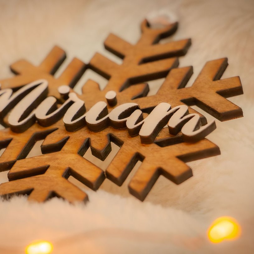 Bola de copo de nieve personalizada con nombre en relieve para colgar en el árbol de navidad combinando madera en dos colores.